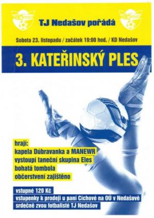 TJ Nedašov pořádá 3. Kateřinský ples, který se uskuteční v sobotu 23. listopadu 2019 od 19:00 hodin v Kulturním domě Nedašov. K tanci a poslechu bude hrát kapela Dúbravanka a Manewr. Vystoupí taneční skupina Eles. Bohatá tombola a občerstvení zajištěno.