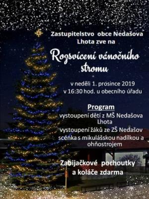 Zastupitelstvo obce Nedašova Lhota zve na rozsvícení vánočního stromu, které se uskuteční v neděli 1. prosince 2019 v 16:30 hodin u obecního úřadu. V programu vystoupí děti z Mateřské školy Nedašova Lhota a žáci ze základní školy Nedašov. Součástí programu bude i divadelní scénka, kterou předvedou dobrovolníci z Lipiny. V závěru nebude chybět ani ohňostroj a mikulášská nadílka pro děti. Zabijačkové pochoutky a koláče zdarma.