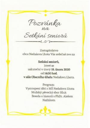 Zastupitelstvo obce Nedašova Lhota Vás srdečně zve na Setkání seniorů, které se uskuteční v úterý 18. února 2020 od 14:00 hodin v sále Obecního úřadu Nedašova Lhota.