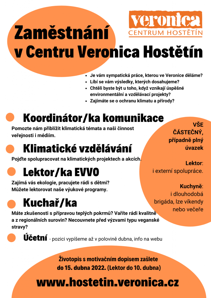 Hledáme posily našeho týmu v ekologickém Centru Veronica Hostětín – NA PLNÝ (částečný) úvazek i na dlouhodobější EXTERNÍ spolupráci. Náplní vaší práce bude výuka a tvorba denních a pobytových programů pro MŠ, ZŠ, SŠ.