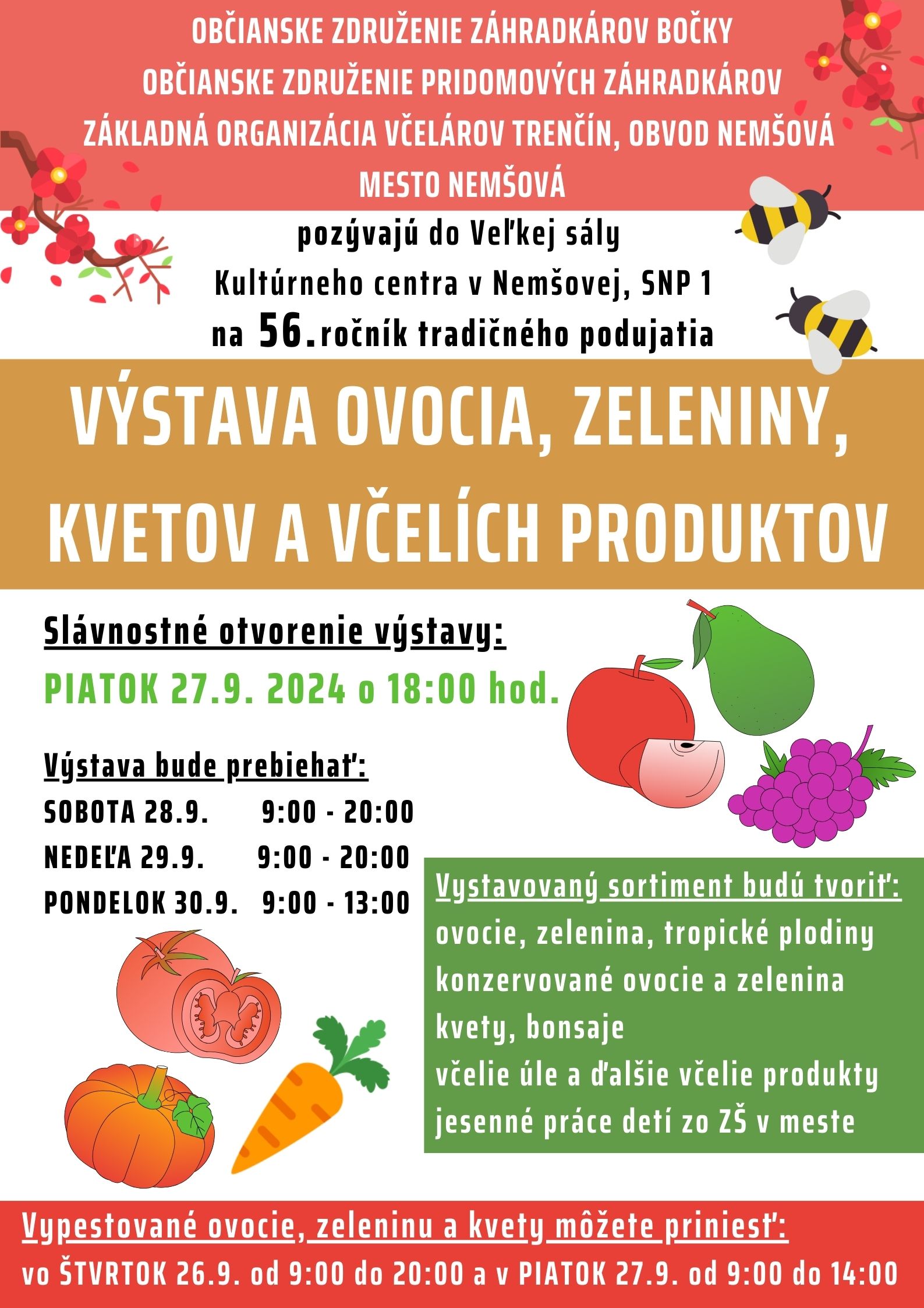 Občianske združenie pridomových záhradkárov, Občianske združenie záhradkárov bočky, Základná organizácia včelárov Trenčín ( obvod Nemšová) a Mesto Nemšová Vás srdečne pozývajú do Veľkej sály Kultúrneho centra v Nemšovej na 56. ročník tradičného podujatia Výstava ovocia, zeleniny, kvetov a včelích výrobkov. Slávnostné otvorenie výstavy sa uskutoční dňa 27. septembra 2024 o 18:00 hod.